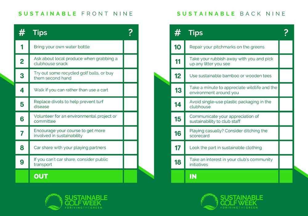 Presented as a traditional golfing scorecard, a front and back nine of tips offer an ideal starting point for golfers to integrate more sustainable habits into their normal golfing lives.