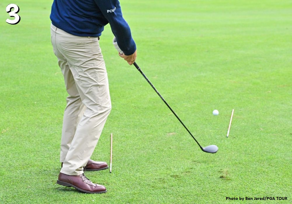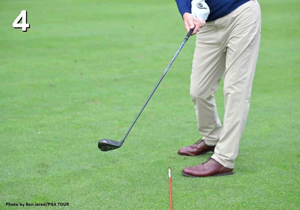 4- The back of the left hand and face of the club are looking toward the sky, not rotating over. The right arm stays behind the shaft, while the toe of the club does not pass the heel through impact. This promotes a left-to-right ball flight.